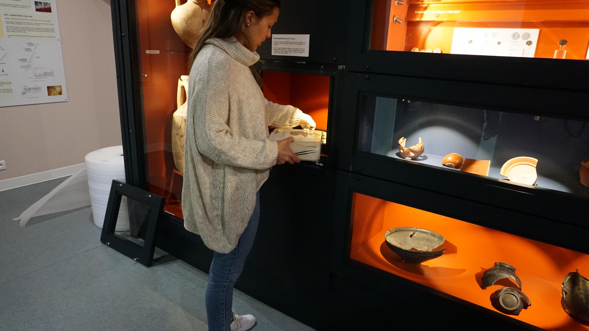 Le retour du cinquième lot d’objets a aussi été l’occasion d’introduire une séance de marquage de certaines pièces. Chaque objet intégrant les collections d’un musée doit être affecté d’un numéro d’inventaire unique qui doit figurer physiquement sur l'objet, de façon à pouvoir faire le lien entre la fiche d'identité et l'objet concerné. Le marquage direct n’est pas fait sur la surface des objets, mais sur une couche de vernis préalablement posé.